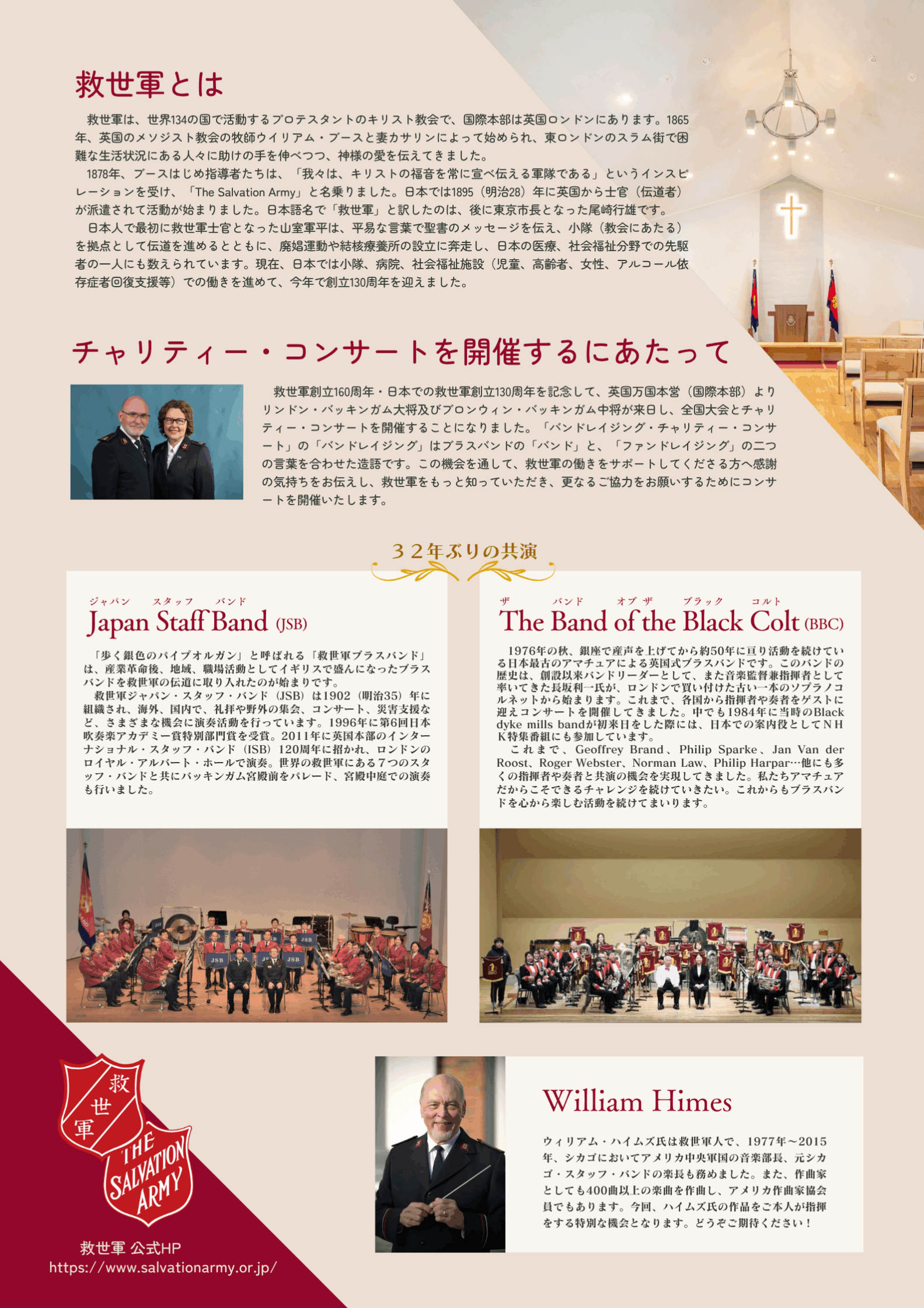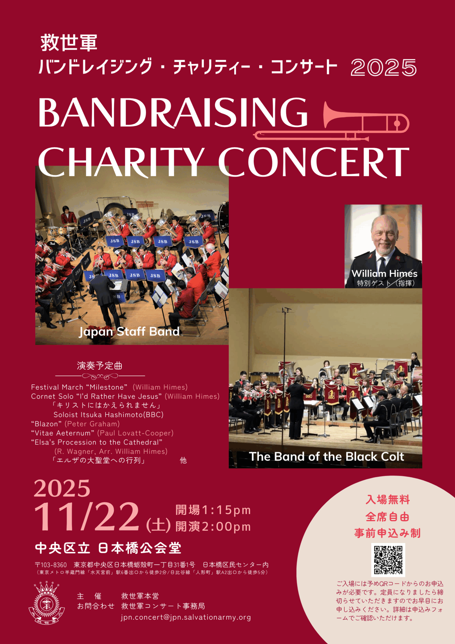 救世軍シカゴ・スタッフ・バンドのウイリアム・ハイムズ元楽長をゲスト指揮者に迎え、JSB(ジャパン・スタッフ・バンド)と BBC(ザ・バンド・オブ・ザ・ブラック・コルト)が共演する「バンドレイジング・チャリティ・コンサート2025」を開催いたします。事前申込制・入場無料・全席自由です。フライヤーに記載のQRコードからお申し込みください。