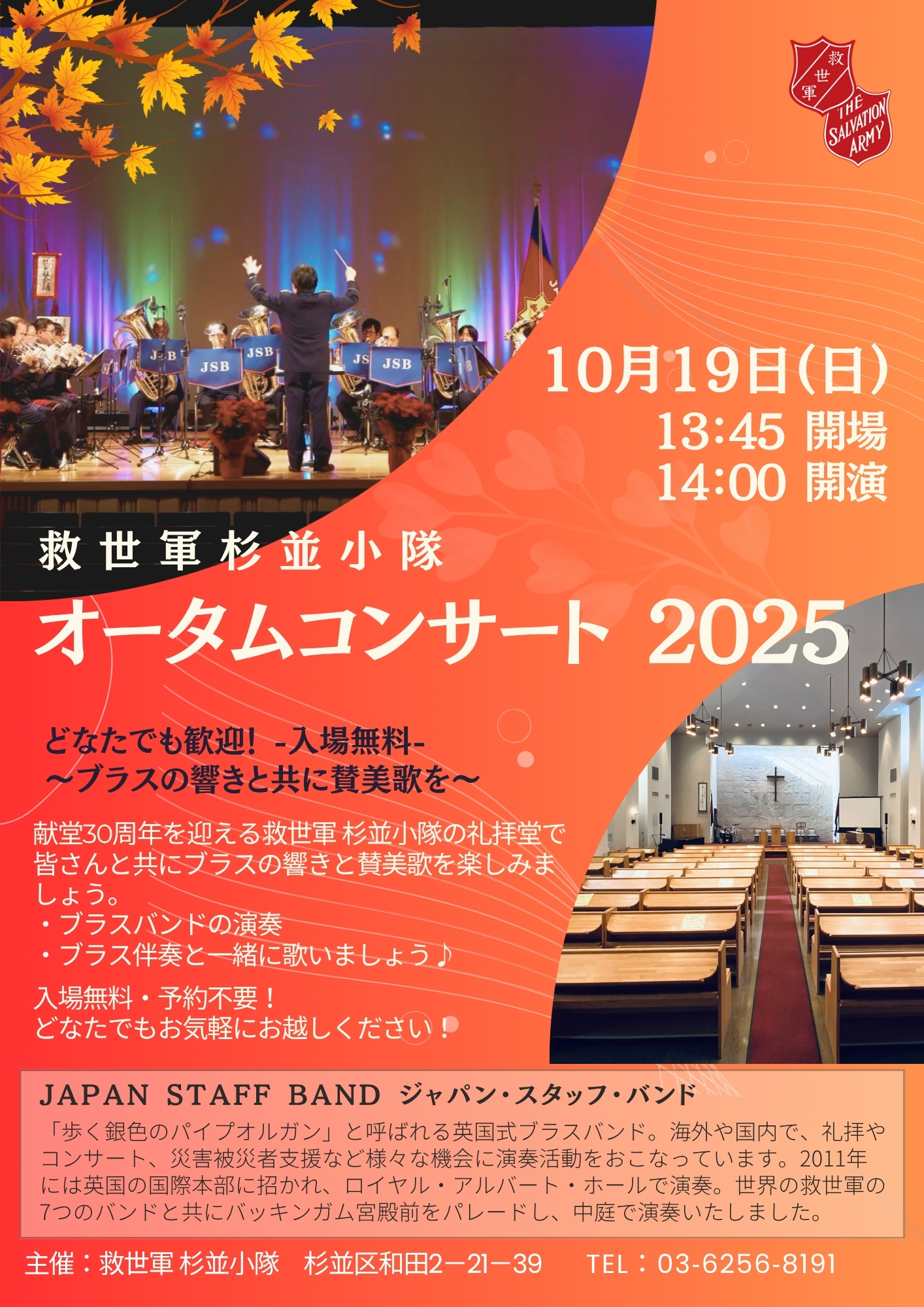 救世軍杉並小隊では献堂30周年を記念してジャパン・スタッフ・バンドによるブラスバンド・コンサートを開催します!