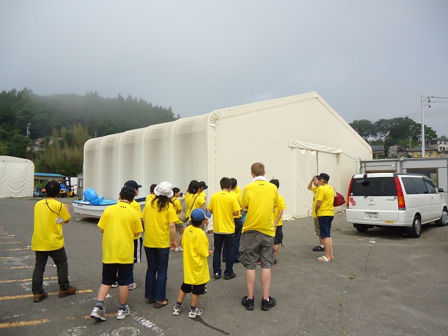 救世軍から支援した袖浜の大型テントも見学しました。牡蠣の出荷など、様々な作業に使われています。