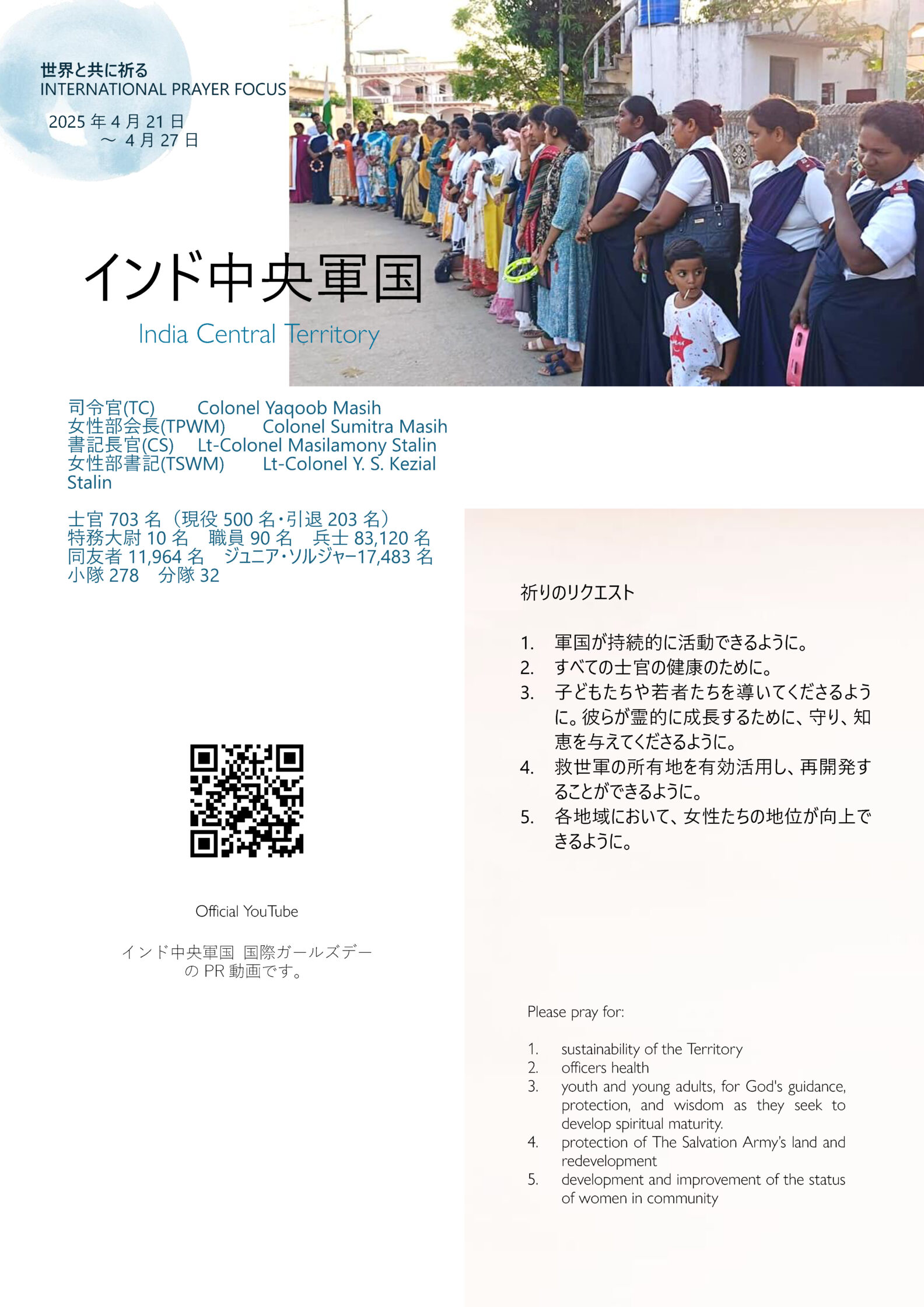 救世軍インド中央軍国(軍国 Territory は「管区」を意味する救世軍の用語です)のために、お祈りをお願いします。