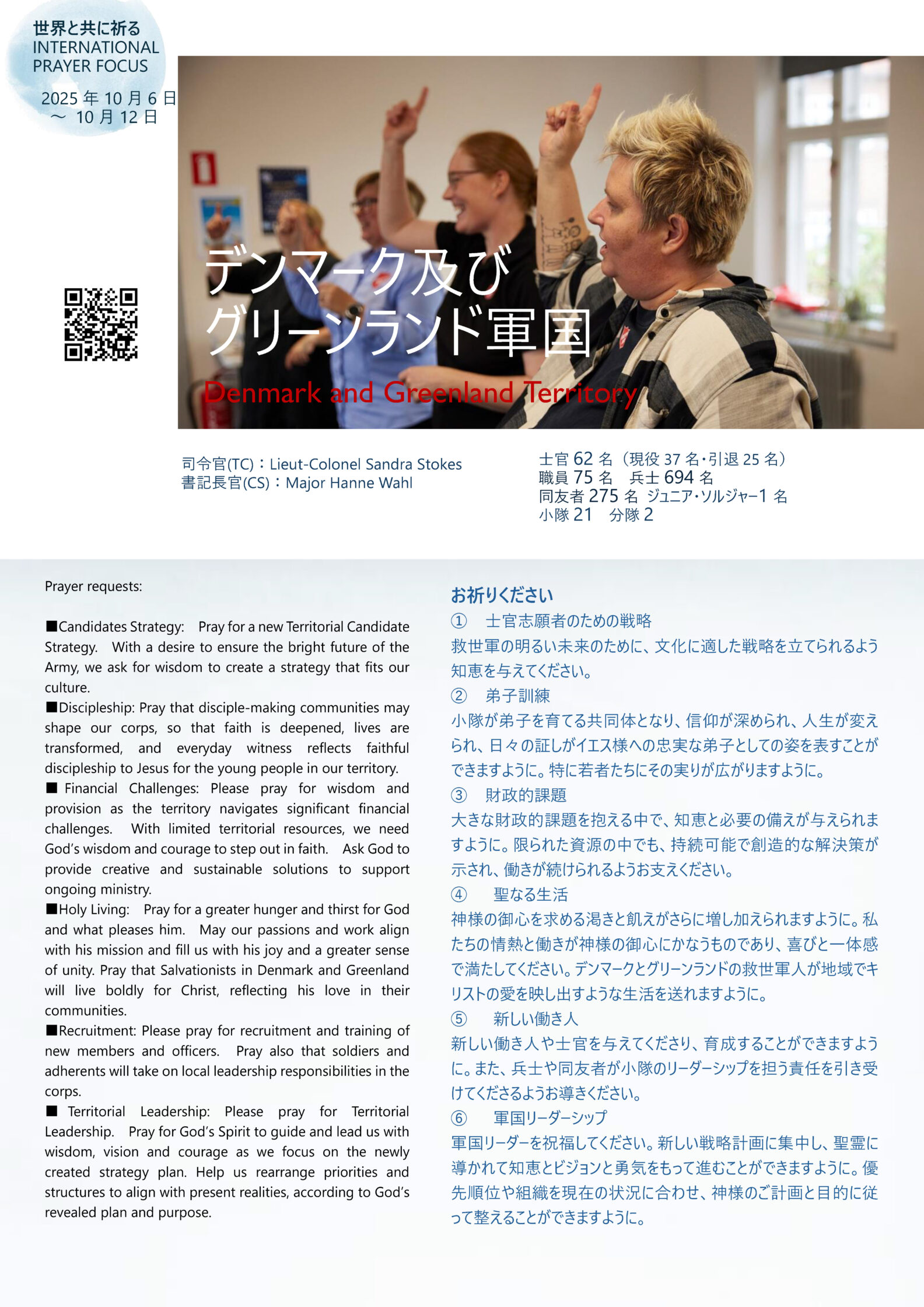 救世軍デンマーク・グリーンランド軍国(軍国 Territory は「管区」を意味する救世軍の用語です)のために、お祈りをお願いします。