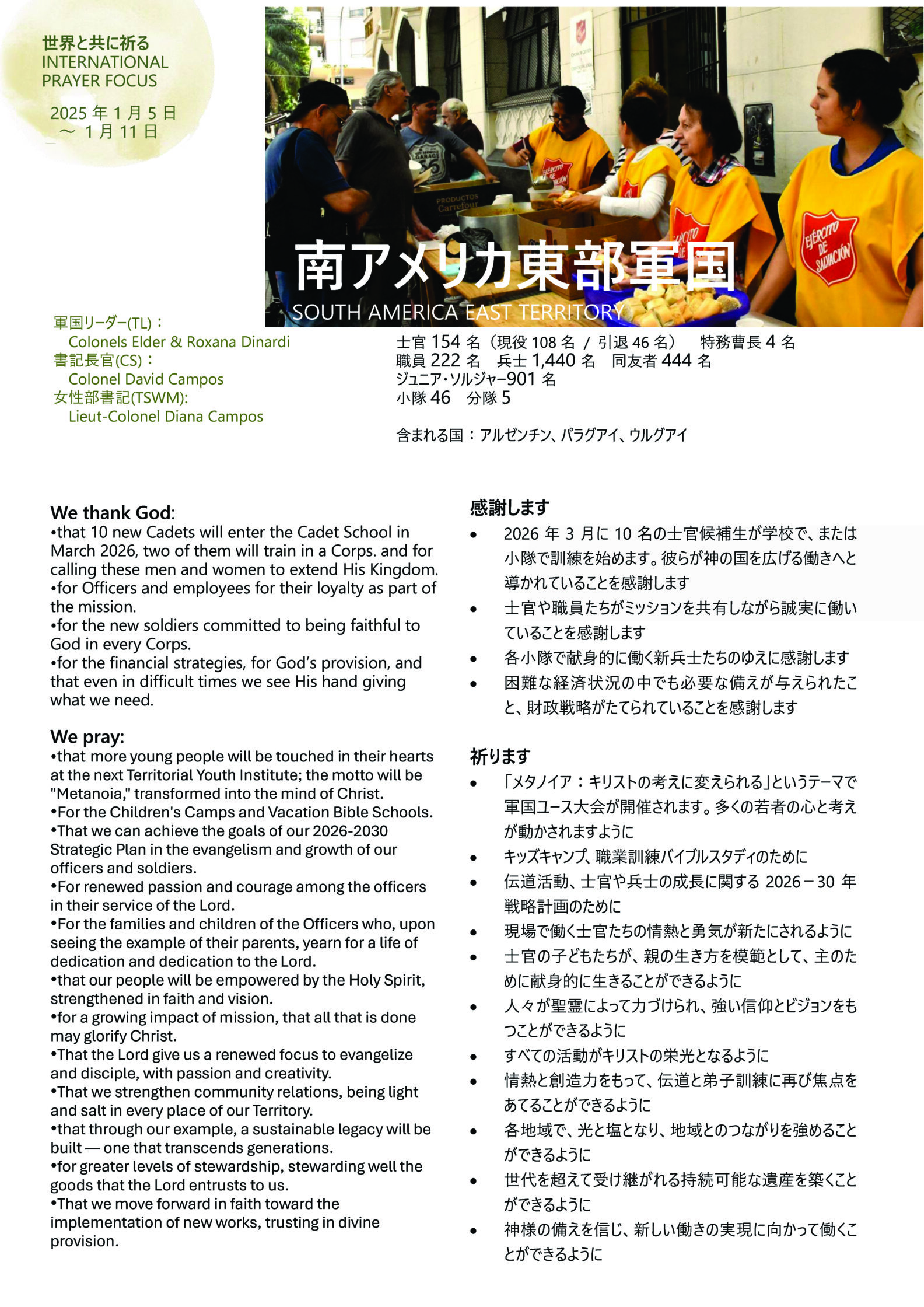 救世軍南アメリカ東部軍国のために、お祈りをお願いします。