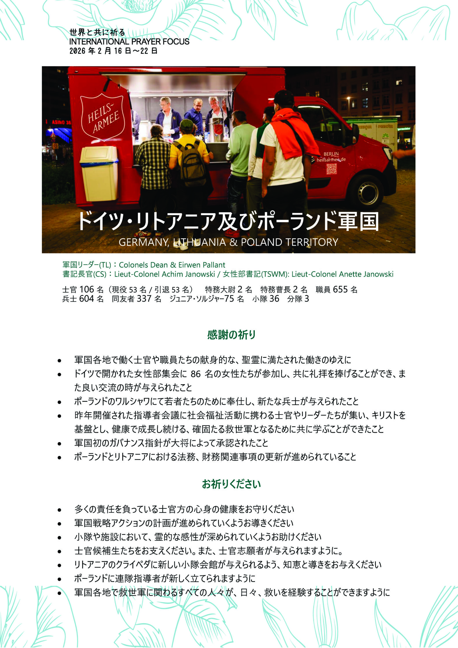 救世軍ドイツ・リトアニア・ポーランド軍国(軍国 Territory は「管区」を意味する救世軍の用語です)のために、お祈りをお願いします。
