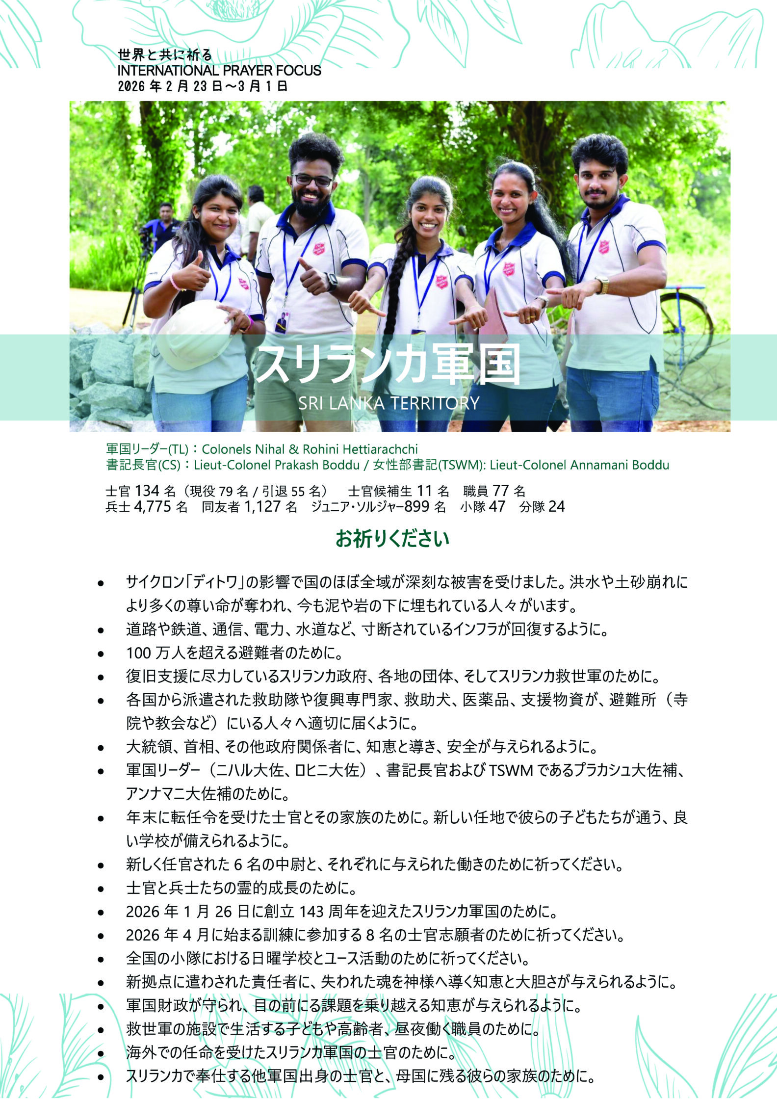 救世軍スリランカ軍国(軍国 Territory は「管区」を意味する救世軍の用語です)のために、お祈りをお願いします。