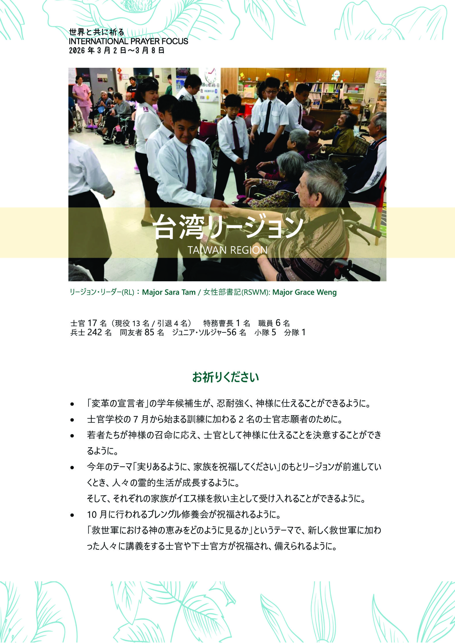 救世軍台湾準地区(リージョン)のために、お祈りをお願いします。