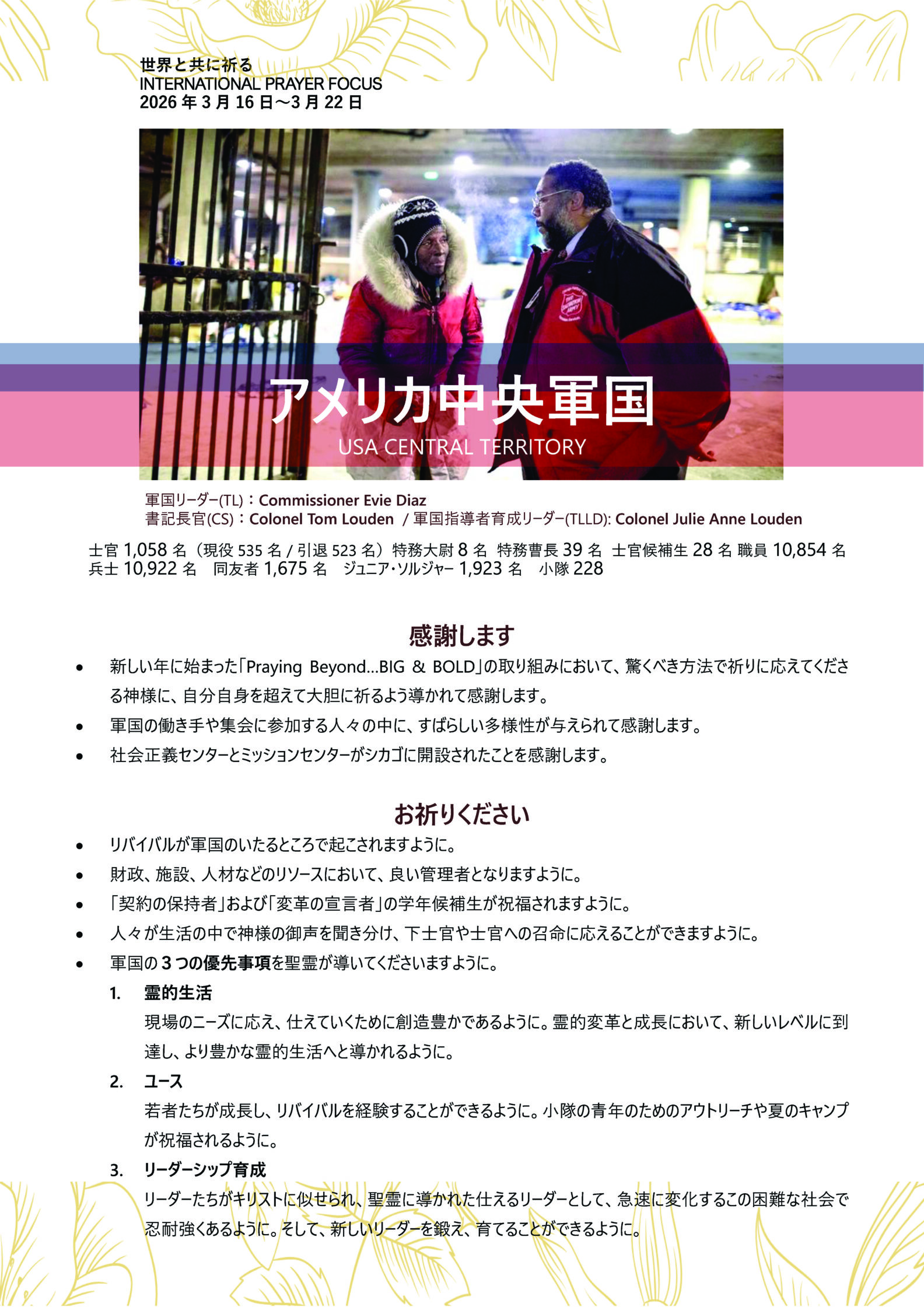 救世軍アメリカ中央軍国(軍国 Territory は「管区」を意味する救世軍の用語です)のために、お祈りをお願いします。