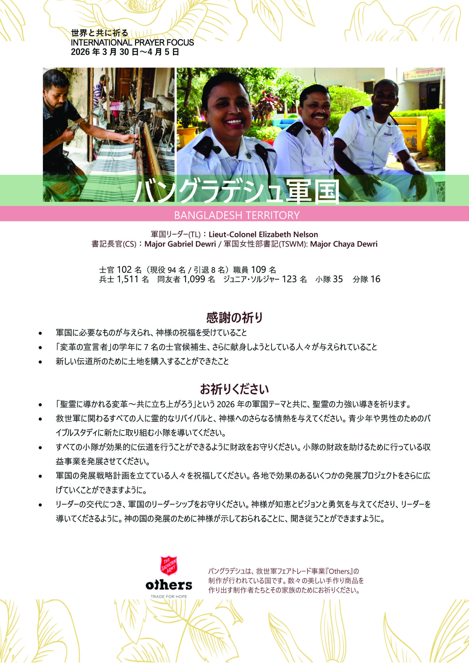救世軍バングラデシュ軍国(軍国 Territory は「管区」を意味する救世軍の用語です)のために、お祈りをお願いします。
