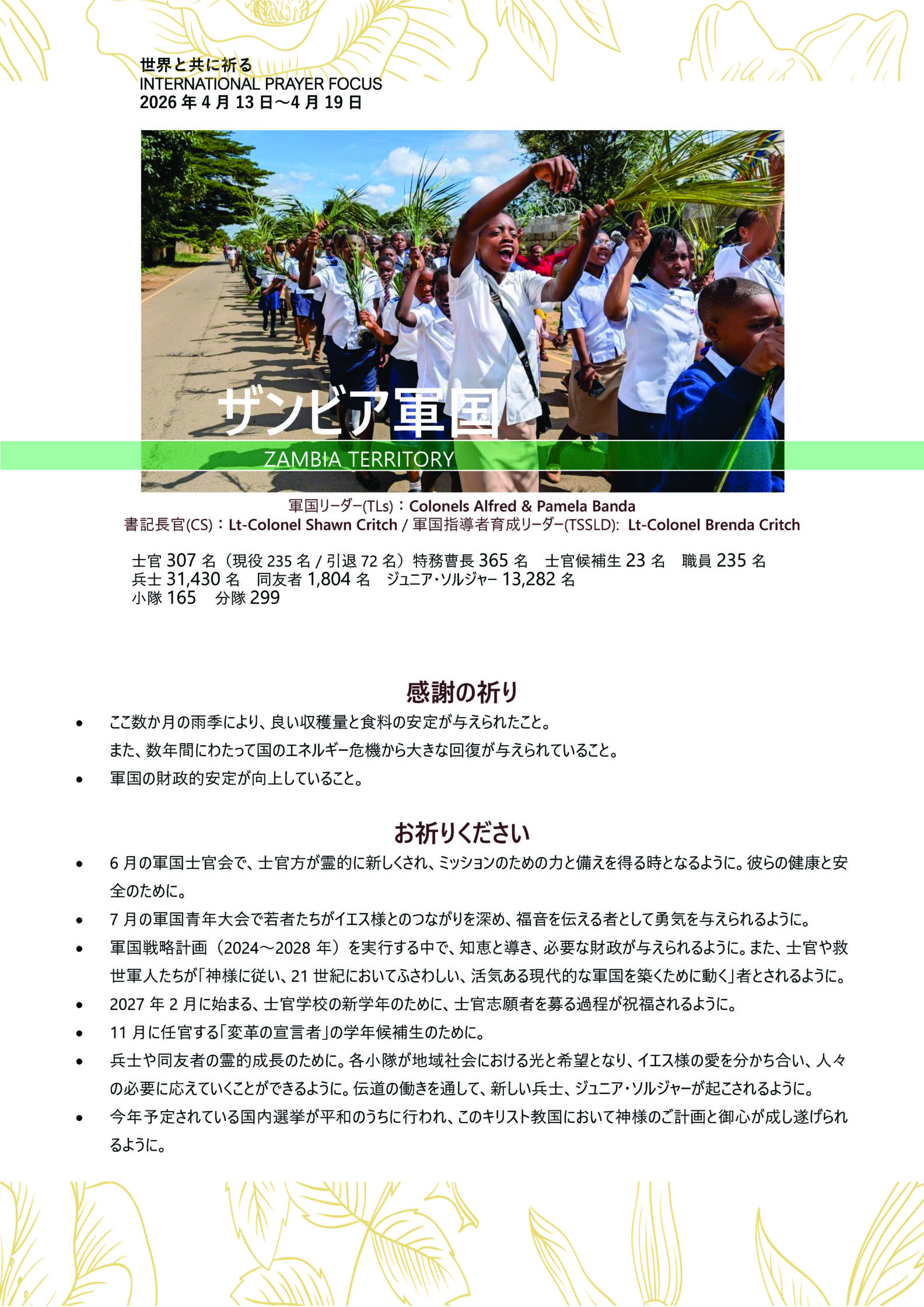 救世軍ザンビア軍国(軍国 Territory は「管区」を意味する救世軍の用語です)のために、お祈りをお願いします。